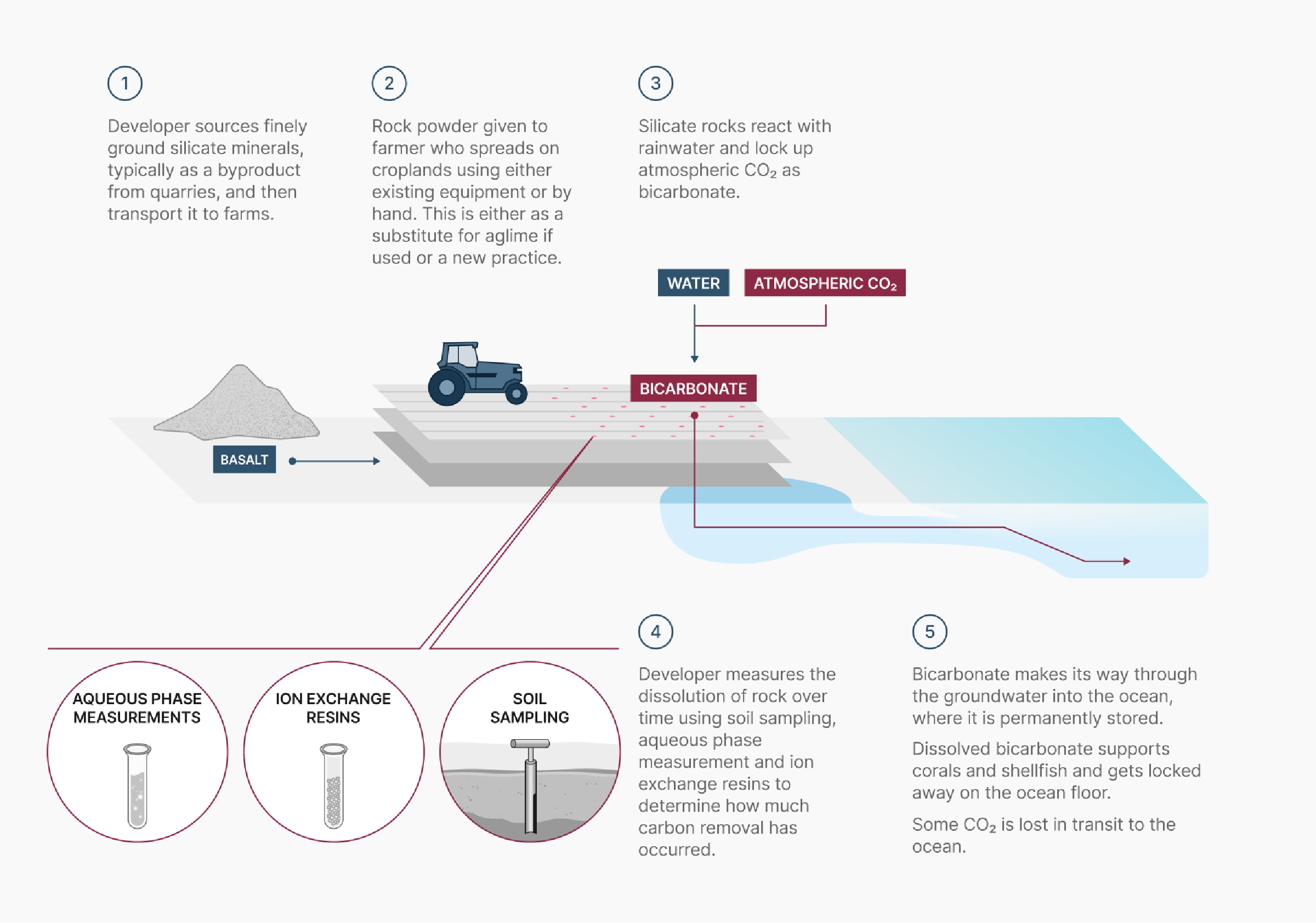Accelerates the natural breakdown of finely crushed silicate rocks (e.g., basalt), allowing atmospheric CO₂ to be permanently captured in stable carbonate minerals. ERW offers exceptional carbon sequestration permanence (thousands to millions of years) and additional agronomic benefits, such as improved soil fertility and nutrient availability. It can be readily integrated into conventional agricultural practices, facilitating widespread adoption.